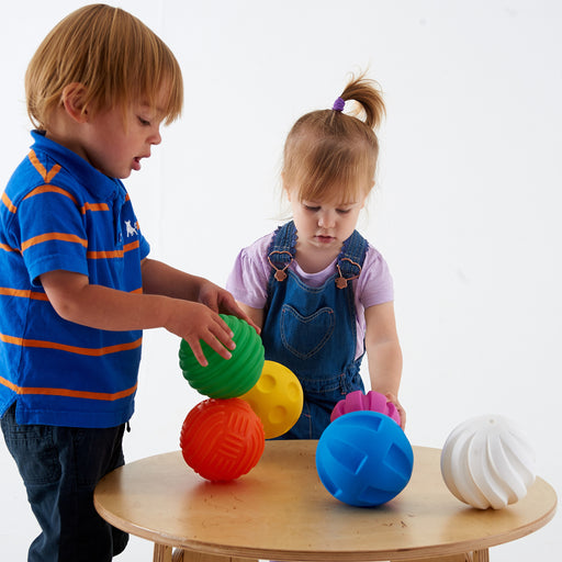 Six differently coloured soft plastic air-filled balls of the right size to enable toddlers and young children to hold them, examine them, play wit...